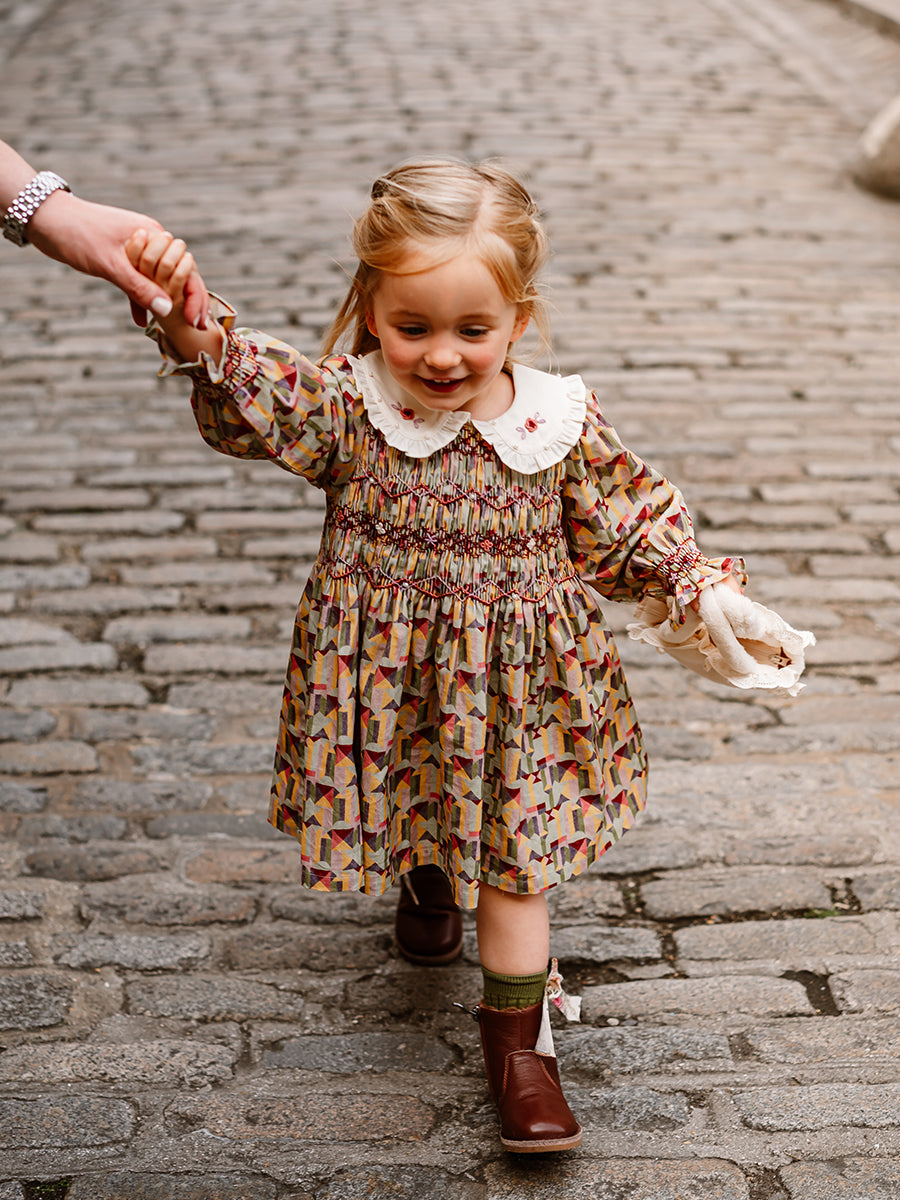 Izzy Hand-Smocking Dress, Colourful Geo, Purple