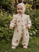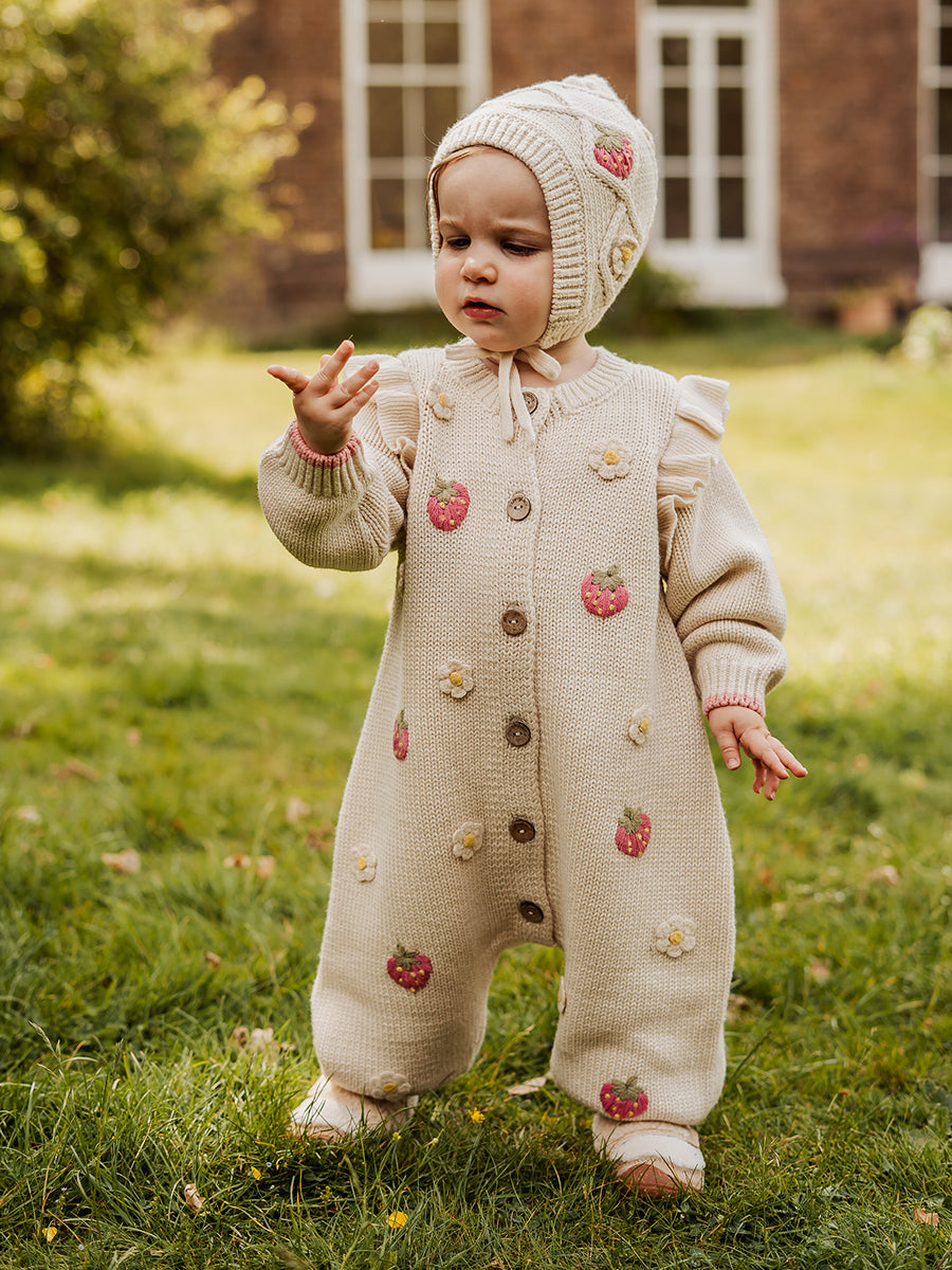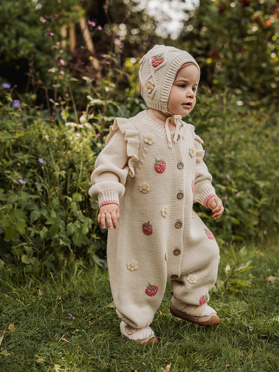 Strawberry Hand-Embroidered Romper, Crème Brulee