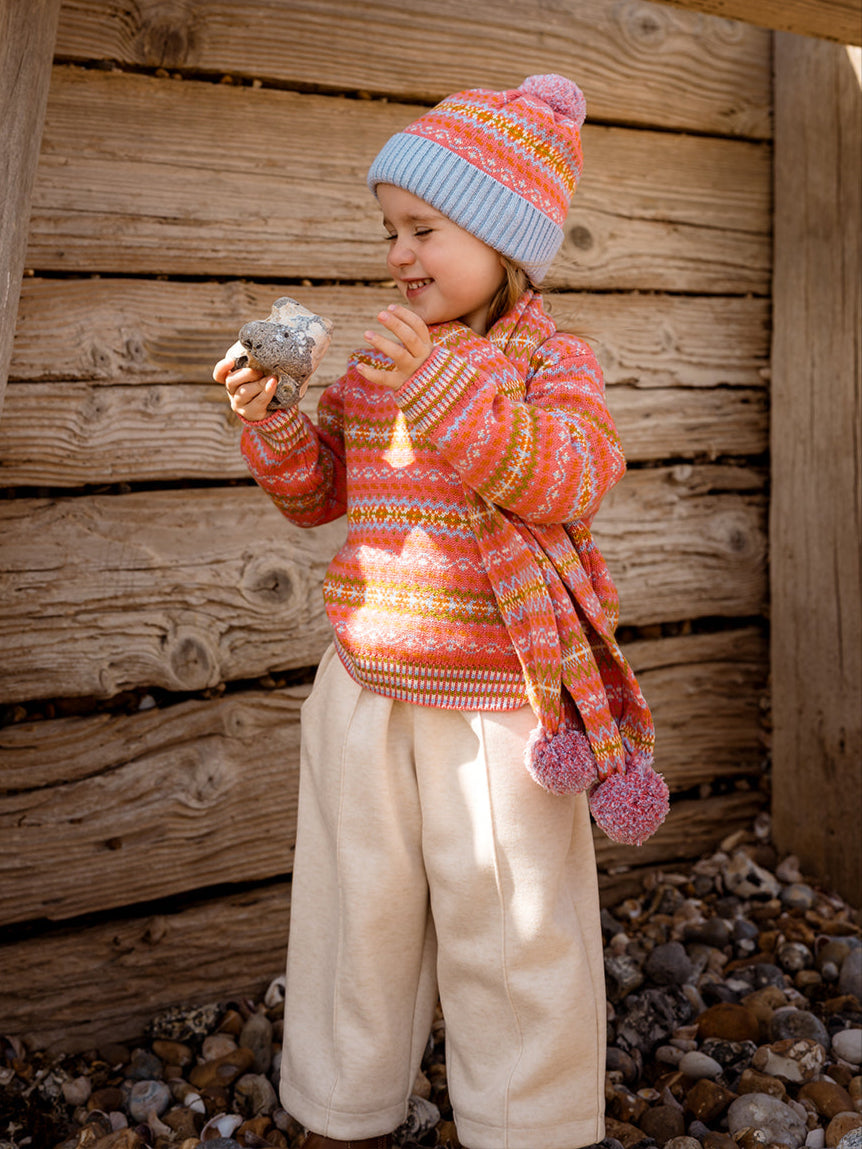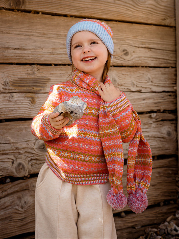 Crafted from the finest natural yarns - plush cashmere, extra-fine merino wool, and soft cotton - our knitwear wraps little ones in breathable warmth and everyday comfort. From timeless silhouettes to our signature Fair Isle patterns, each piece is designed and knitted in-house.